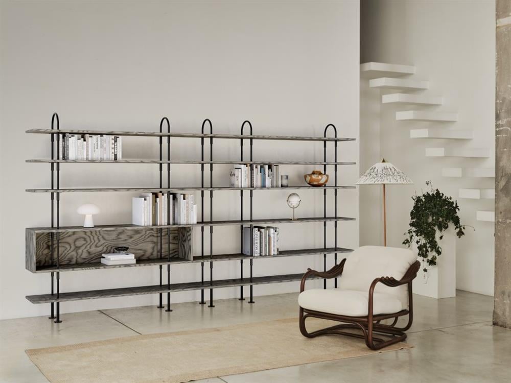 Das System ist sowohl in der Höhe als auch in der Breite verstellbar und kann freistehend, an der Wand montiert oder als Raumteiler verwendet werden. Das Ergebnis ist ein Regal, das sich in jeder Konfiguration vollständig anfühlt – und das die Dinge unterstützt, mit denen wir uns umgeben.