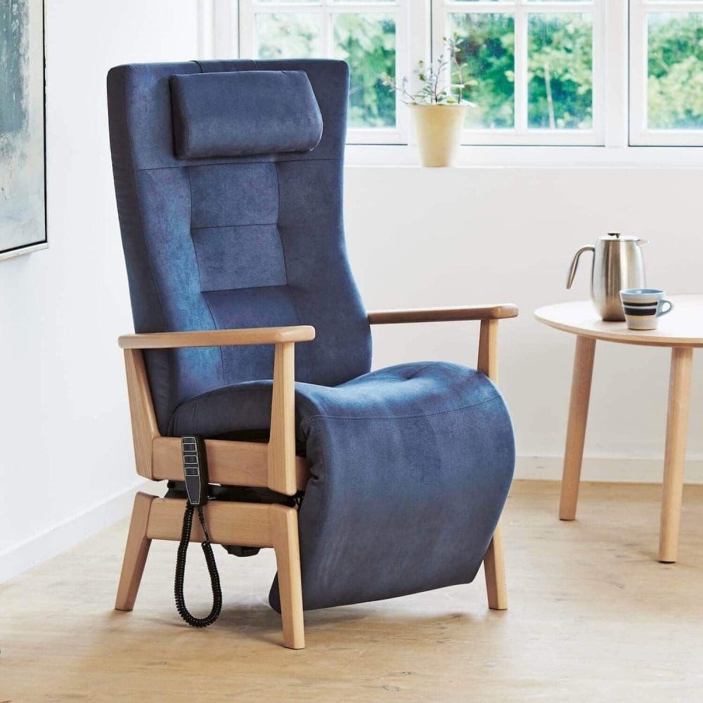 Ein schöner und eleganter Ruhestandsstuhl mit genau dem richtigen Sitzkomfort. Der Otium Stuhl verfügt über Funktionen wie Sitzhöhenverstellung und eine integrierte, elektronische Fußstütze sowie ein bequemes Nackenkissen. Darüber hinaus können Sie wählen, ob Ruhesessel kabelgebunden oder mit Akku ausgestattet sein sollen.