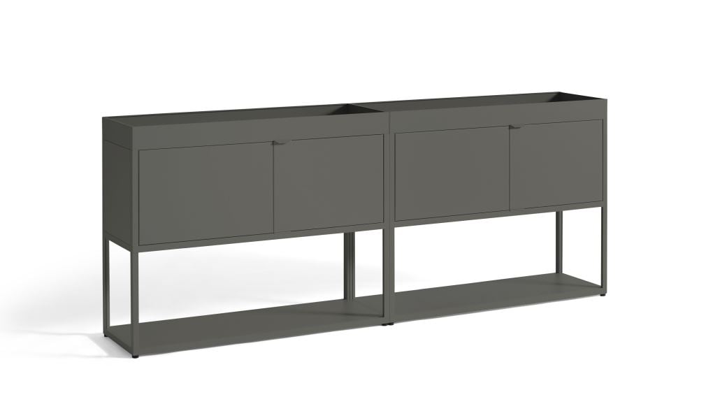 Praktisches Aufbewahrungssystem aus der New Order-Kollektion von HAY. Die von Stefan Diez entworfene Kollektion ist ein fantastisches, anpassbares Aluminium-Regalsystem. Es lässt sich nach Belieben zusammenstellen und kombinieren, was eine Vielzahl an Kombinations- und Individualisierungsmöglichkeiten bietet, die genau auf Ihre persönlichen Bedürfnisse zugeschnitten werden können. Ob es sich um ein Bücherregal im Wohnzimmer, einen neuen Stauraum im Heimbüro, einen neuen Stauraum in der Küche oder ein Regalsystem im Flur oder Schlafzimmer handelt, New Order lässt sich individuell gestalten. Mit dem New Order Regalsystem erhalten Sie ein robustes System, das leicht zu warten ist. HAY New Order Kombination 202 besteht aus einem Bücherregal mit 2x3 Regalen und zwei Stahltüren. Funktionelle und praktische Aufbewahrung mit HAY.