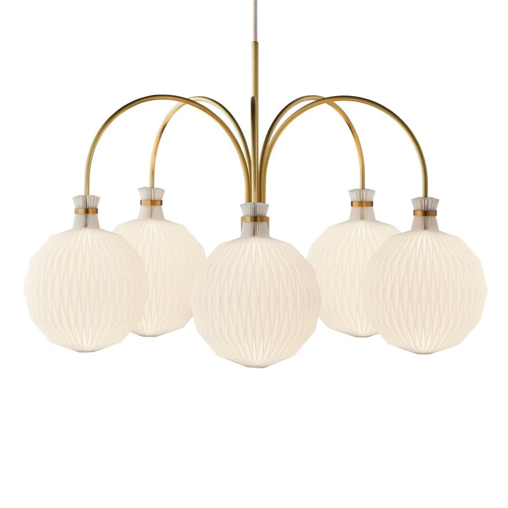 Modell 101 Kronleuchter ist ein stilvoller Kronleuchter mit fünf Armen und einem Durchmesser von 66 cm, wobei die eleganten Messingarme fünf wunderschön handgefaltete Lampenschirme tragen. Die Arme laufen in einem harmonischen Mittelstück mit einer sanften Rundung zusammen, die der Leuchte einen ausgewogenen und zeitlosen Ausdruck verleiht.