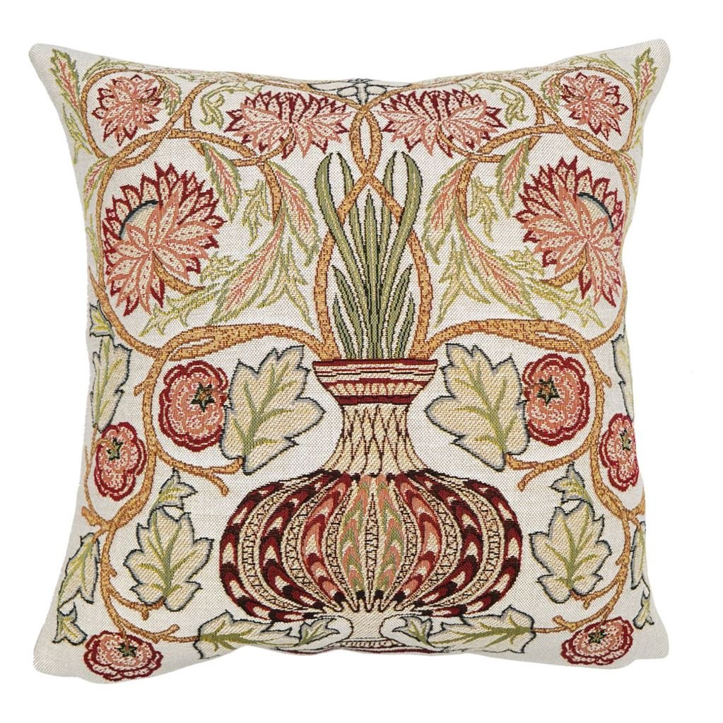Elegantes Kissen von Jules Pansu, inspiriert von William Morris' klassischem Blumentopf-Muster. Das Motiv zeigt Morris' charakteristisches Zusammenspiel von Blumen, Blättern und natürlichen Formen in einer harmonischen und detailreichen Komposition. Das Kissen bringt die Schönheit der Natur und ein Gefühl handwerklicher Tradition in Ihr Zuhause und passt perfekt in moderne und klassische Umgebungen.