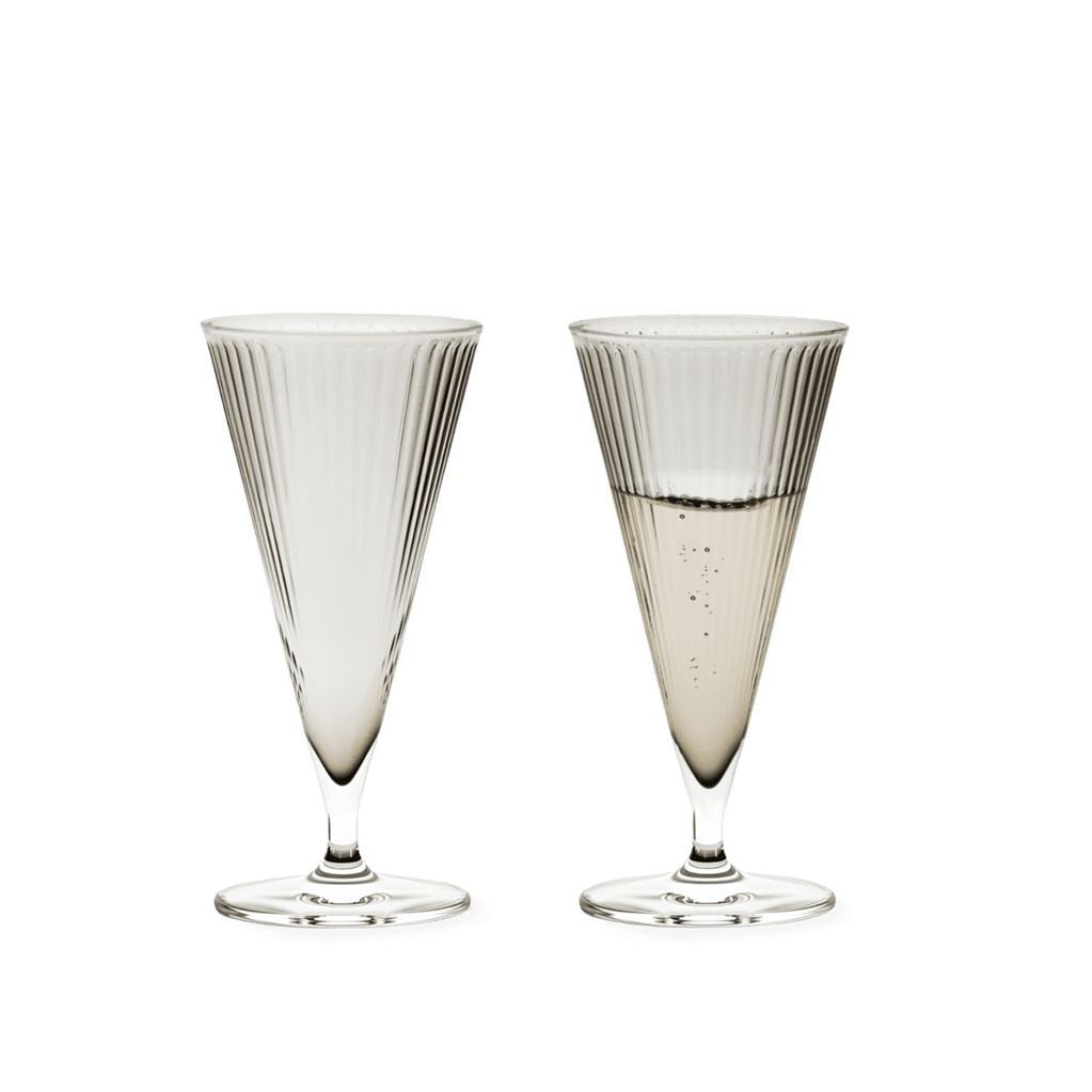 Rustikale und elegante Champagnergläser von Rosendahl, perfekt für den täglichen Gebrauch. Die Gläser sind in einem schönen Rauchton gehalten und weisen wiederkehrende Rillen auf der Oberfläche auf, die ein raffiniertes optisches Spiel erzeugen. Da die Gläser mundgeblasen sind, ist jedes ein Unikat und ein elegantes Beispiel für funktionale Gläser für den modernen Alltag.