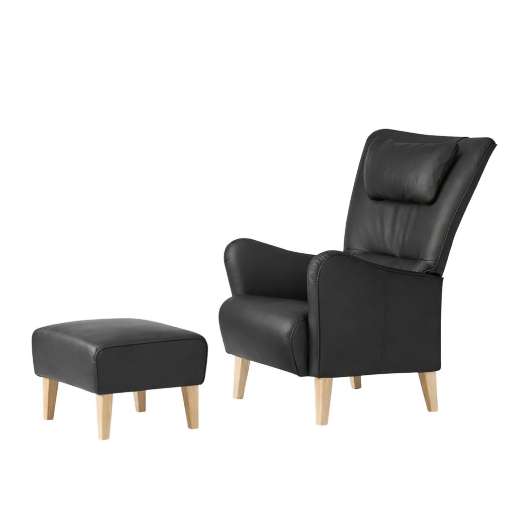 Swedese Stepp Sessel inkl. Nackenkissen und Hocker – Geölte Eiche/Schwarzes Nevada-Leder