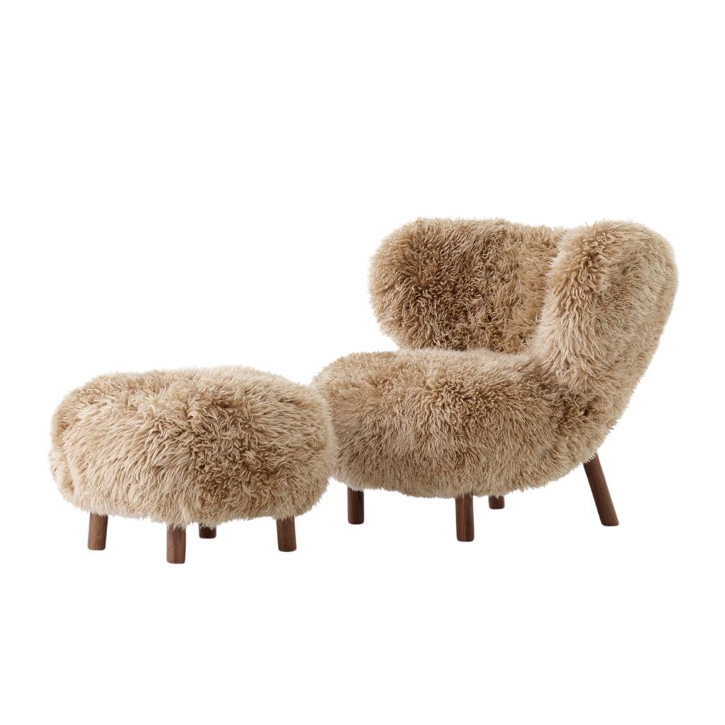 &Tradition Little Petra VB1 Loungechair & ATD1 Pouf – Geöltes Walnussholz/Schaffell Sahara